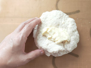 3:室温に戻したマーガリンを挟むようにして包み、台に移して、表面が滑らかになるまで10分ほど捏ねます。