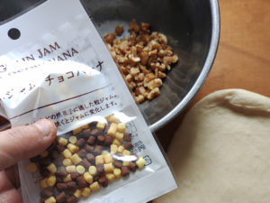 4:今回は、つぶジャム チョコバナナ(セリア)とくるみ(ダイソー)を使いました。