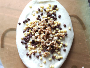 5:生地を楕円形に伸ばし、軽く押さえて埋め込むようにして、つぶジャムと粗く刻んだくるみを加えます。