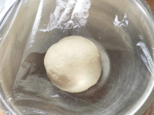 7:生地を丸めて、閉じ口を下にしたら、ボールに入れて、ラップをかけ、35度のオーブンで30分ほどかけて一次発酵させます。