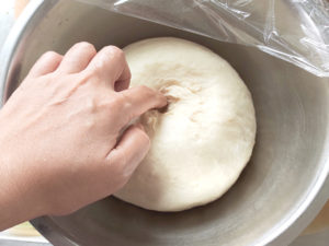 8:生地が1.5倍くらいに膨らんだら、ガス抜きをしましょう。