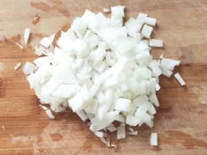 ![]() 1:玉ねぎは皮をむき、みじん切りにします。 |