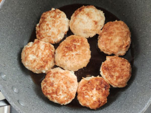 ![]() 5:フライパンに薄く油(分量外)を引き、弱火でまず片面を3分ほど焼いて、焼き色を付けます。 |