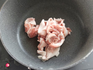 1:フライパンに薄く油(分量外)を引き、食べやすい大きさに切った豚こまが白くなるまで炒めます。