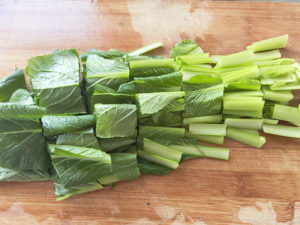 2:小松菜は根元を落としてよく洗ってから、5cm幅くらいに切りましょう。