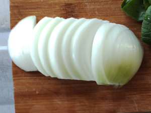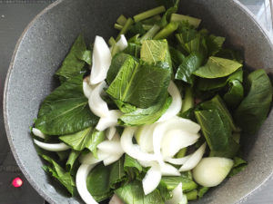 4:豚肉を一旦取り出し、フライパンに残った油で、小松菜と玉ねぎが軽くしんなりするまで炒めましょう。