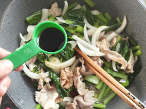 小松菜の買い置きがあったので、豚こまと玉ねぎと一緒に肉野菜炒めにしてみました。わさびを効かせて、ちょっと爽やかな辛さを演出。時短クッキングです。