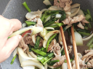 6:豚肉を戻し入れたら、火を止めて、わさびを加え、全体に味が絡むように混ぜ合わせましょう。