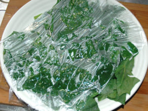 ![]() 1:ほうれん草は食べやすい大きさに切り、ラップをして、レンジで3分ほど加熱します。 |