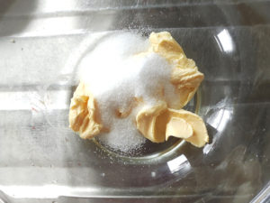![]() 1:タルト生地のマーガリンをレンジで10~20秒加熱し、柔らかくします。 2:タルト生地の砂糖を加え、白っぽくふわふわするまですり混ぜましょう。 |