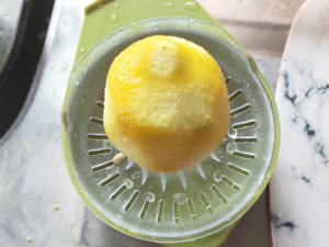 ![]() 14:レモンは皮をお湯で洗ってから、黄色い部分だけをすりおろしましょう。 15:その後レモンを半分に切り、果汁を絞ります。 (果汁が足りない場合は、ポッカレモンを足してください。) |