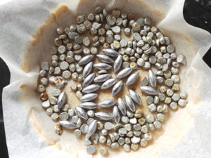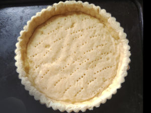 ![]() 11:生地の底にフォークで均一に穴を空け、クッキングシートを敷いてから、パイ重しを乗せ、200度で10分空焼きをします。 |