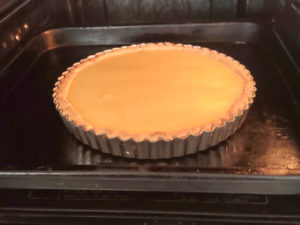 ![]() 19:型を天板に乗せた状態で、オーブンに入れ、フィリングをもう一度かき混ぜてから、そっと流し入れます。 (型に入れてからだと、フィリングがこぼれるので、オーブンに入れたままで注ぎます。) |