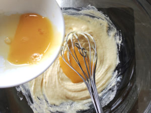 ![]() 3:タルト生地の卵を少しずつ加え、その都度良く混ぜます。 |