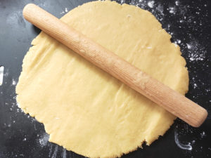 ![]() 7:生地を冷蔵庫から出したら、パイ皿の底を台に乗せ、その上で底よりも2回りくらい大きくなるまで、生地を円状に伸ばします。 |
