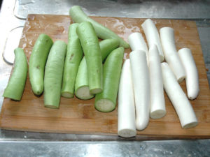 ![]() 1:白なすと緑なすは、ヘタを取り、食べやすい大きさに切ります。 (今回は細長い形をしていたので、それぞれ二等分しました。) |