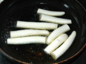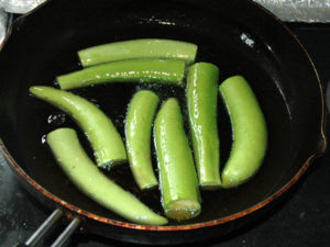 ![]() 2:フライパンに揚げ油を用意します。 3:油の温度を160度に設定し、表面が軽く焦げるまで緑なすを揚げましょう。 |
