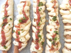 今回超ロングソーセージを使ってますが、普通のロングソーセージなら、生地ですっぽりと覆えるはずです。