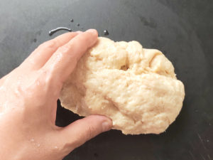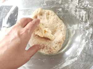 ![]() 4:生地がまとまったら、マーガリンを加え、全体になじむまで捏ねましょう。 |