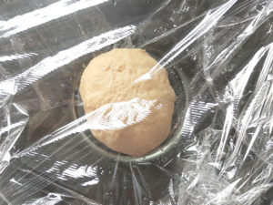 ![]() 6:ボールにラップを敷いて、丸めた生地を乗せ、更に上からラップをして、30度のオーブンで1時間、1次発酵させましょう。 |