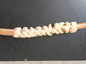 ![]() 10:ソーセージを一旦取り置き、中央にケチャップと粒マスードを少量、線状に置きます。 11:左から右の順番に、中央に生地を持ってくる感じで編み込みましょう。 12:天板に編み込んだ生地を1本ずつ乗せ、同じ作業を繰り返したら、再びラップをして、30度のオーブンで30~40分置いて二次発酵させます。 |