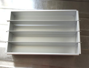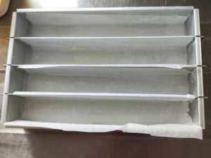 ![]() 1:まず、バッテンバーグケーキのケーキ型は、こんな感じになっていて、分量さえ計れば、シートを敷くだけで簡単に長方形のケーキが4つ焼けます。 |