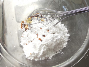 ![]() 7:次にコーヒー生地に移りますが、牛乳小2でインスタントコーヒーを小2分溶かしておき、ついでにクルミは細かく刻んでおきましょう。 |