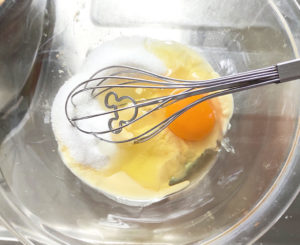![]() 3:ベイクオフの番組では、生地を一気に作り半量に分けてからでしたが、失敗しないために、バニラ風味とコーヒー風味の生地を別々に作っていきましょう。 4:バニラの方の卵と室温に戻したマーガリン、カスターシュガーの代わりにグラニュー糖を良く混ぜます。 |