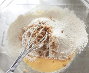 ![]() 8:ボールに室温に戻したマーガリンと卵、コーヒー液、刻んだクルミを加え、さらに薄力粉とベーキングパウダーを合わせてふるって、先ほどと同じように泡だて器で混ぜます。 9:こちらも生地が滑らかになればOKです。 |