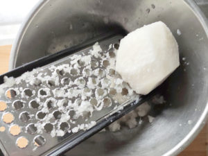 ![]() 1:大根は皮をむき、おろし金ですりおろします。 (水分が気になる場合は、ざるの上ですりおろすと良いです。) |