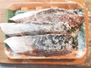 ![]() 2:ブリの水分をキッチンタオルで拭き取り、片栗粉を全体にまぶしましょう。 |