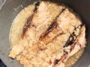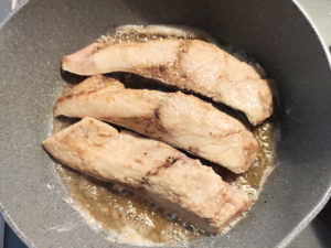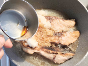 ![]() 3:フライパンに少し多めに油(分量外)を引き、ぶりを揚げ焼きし、両面に焼き色を付けます。 |