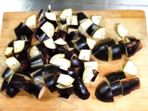 ![]() ①なすはヘタを取り、皮に浅く格子状に切れ目を入れてから、一口サイズに切ります。 |