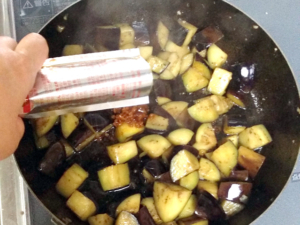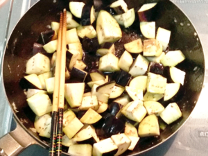![]() ③フライパンに多めに油を引き、ナスがくたっとするまで炒めます。 (ナスはすごく油を吸うので、くたっとするまで、油を足しながら炒めてください。) |