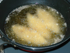 ![]() 2:190度くらいの少し高めの温度の油で、白身フライをキツネ色になるまで揚げましょう。 |