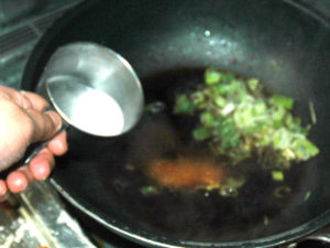 ![]() 6:調味料が溶けたら、ネギと片栗粉を水で溶いた物を加え、弱火で加熱します。 7:若干とろみがつけば、南蛮ソースの完成。 |