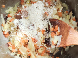 ![]() 5:一旦火を止めてから、鍋に薄力粉と崩したマギーブイヨンを加えて、良く混ぜあわせます。 |