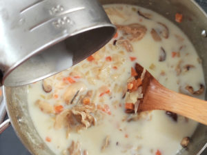 ![]() 6:粉がなじんだら、牛乳とホタテを加え、良く混ぜ、中火にかけ、混ぜながら、3分加熱しましょう。 7:味塩コショウをふりかけ、調味すればOK。 |