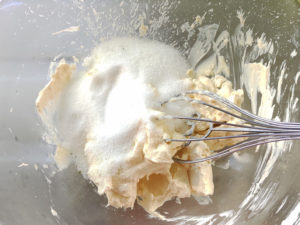 ![]() 1:耐熱ボールにクリームチーズを入れ、ラップをして1分半ほどレンチンし、柔らかいクリーム状にします。 2:砂糖を加えて、ザラザラ感が消えるまでしっかりと混ぜましょう。 |