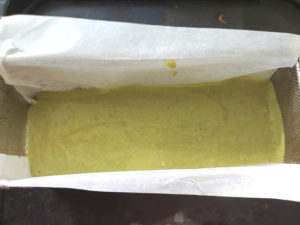 ![]() 6:シートを敷いたパウンド型に生地を流し入れ、平らにならします。 |