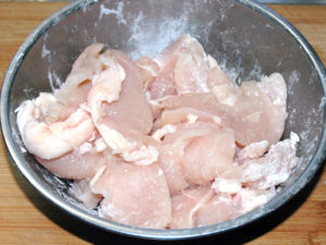 2:ボールに鶏肉と片栗粉を入れ、片栗粉を薄く全体にまぶしましょう。