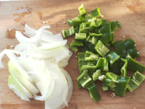 ![]() 1:玉ねぎは皮をむいて薄切りに、ピーマンは種とヘタを取って一口サイズに切ります。 |