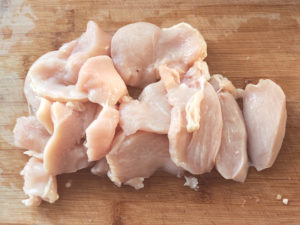 ![]() 2:鶏肉は、5mm厚さくらいのそぎ切りにしましょう。 |