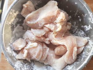 ![]() 5:鶏肉をボールに入れ、まぶし用の片栗粉を全体にまぶします。 |