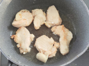 ![]() 6:別のフライパンに少し多めに油(分量外)を引き、鶏肉の表面に焼き色が付くまで焼きましょう。 7:焼けたら、盛り付け用の皿に取り出します。 (少ししっかり目に火を通してください。) |