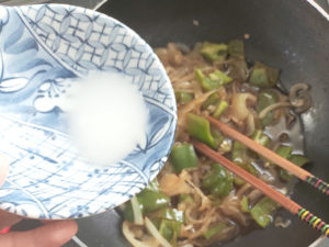 ピーマンが生だと美味しくないので、先に玉ねぎと一緒に炒めてみました。