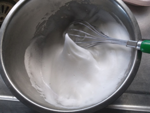 ![]() ①卵白に砂糖をひとつまみ加えて泡立て始め、クリームくらいの硬さになったら、残りの砂糖を二回に分けて加え、ピンと角が立つまで泡立てます。 |