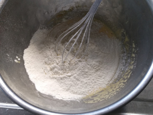 ![]() ⑤薄力粉とベーキングパウダーを一緒にふるい入れ、粉っぽさがなくなるまで混ぜましょう。 |