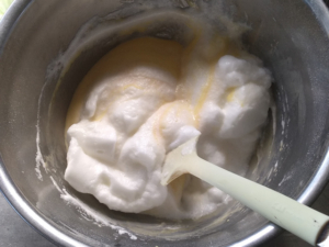 ![]() ⑥メレンゲを全量加え、ゴムベラでさっくりと練らないように混ぜます。 |
