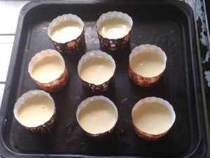 ![]() ⑦紙製のカップケーキ型に、それぞれ生地を8分目の高さまですくいいれます。 |